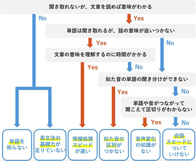 そこでこの記事では、まずフローチャートであなたがリスニングができない原因を探っていただき、その原因に最適な上達トレーニング方法を伝授していきます