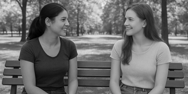 ・Two women are sitting on a bench.(2人の女性がベンチに座っている)