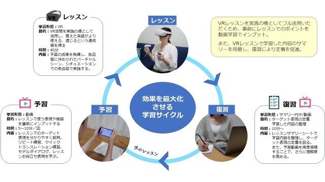 ●VRオンラインレッスンの前後に、学習サイクルを意識して予習、復習をセットにしてカリキュラムを拡張。オンライン学習での効果を最大化させる。