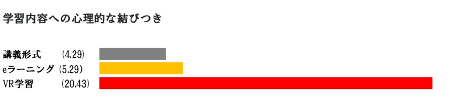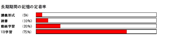 VR(仮想現実)は限りなく現実に近い世界に没入する感覚を得ることができ、ゲームや音楽ライブ等、エンターテイメントの分野で多くのコンテンツが提供されてきましたが、昨今ではVRの特長を生かし、教育や研修へとその活用範囲が広がっています。教育・研修にVRが使用されている背景にはその高い学習効果があります。イマースがまとめた調査によると、VRを活用した学習では学習内容の75%が記憶され、講義形式(5%)、読書(10%)、動画学習(20%)に比べ、高い長期記憶保持効果があるという結果(図1)や、深い没入感を得られるという特性により、学習におけるコンテンツへの心理的な結びつきが講義形式、eラーニングに比べて圧倒的に高いという結果(図2)も出ています。英語学習の面でも、中央大学国際情報学部 斎藤裕紀恵准教授のゼミでは、VRを用いた英会話授業の実証実験において、英語スピーキングに対する不安・恐れの軽減や学習意欲上昇への寄与が確認されています。