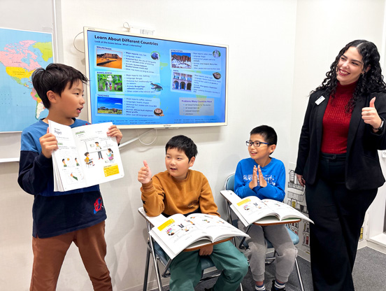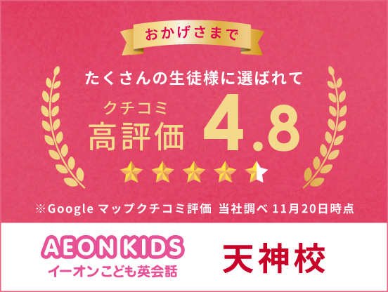 Nさん楽しい授業だけではなく、手厚いご指導をしてくださいます。英語を楽しく学ぶだけではなく、子どもの疑問にも丁寧に答えてくださるので、家族が教えるよりもずっと理解しやすいようです。家での復習も、授業でしっかりと理解をしてきているので苦手意識なく取り組んでいる様子が見えます。先生方が親身になって指導してくださっているおかげです。先生方もスタッフの方もいつでも明るく接してくださるので、毎週楽しく通っています。私自身も学生時代に通っていたのがAEONだったので、世代を超えて学べていて嬉しいです。