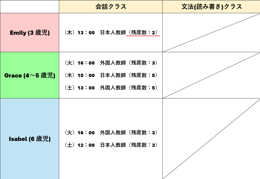 Pさん子どもがお世話になっています。先生方が楽しく明るく接してくださるので、英語に抵抗感なく楽しく通っています。欲を言うと、外国人講師の先生が頻繁に変わるので、できるだけ同じ先生に教えていただけると嬉しいです。