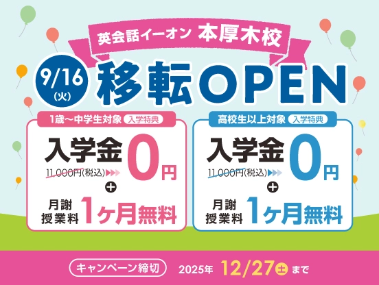 イーオン本厚木校は 9月16日(火)本厚木駅 北口から徒歩8分Lavie本厚木ビル2階 に移転OPENいたしました。