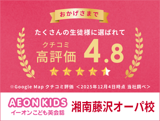 親子でイーオン藤沢オーパ校に通ってます!先生もスタッフのみなさんもフレンドリーで、いつ行っても明るく優しく迎えてくれます。娘は2歳頃から通っていますが、歌やゲーム、お絵かきや絵本などを交え楽しみながら英語を学べています。私自身も娘と一緒に英語を話せるようになりたいと思い通い始めました🙌🏻 毎週イーオンに来る時間が、自分のための貴重な時間になり英会話が私のストレス発散です☺️ 最近、50代の母もイーオン生になりました。これからも親子3代でよろしくお願いします♩