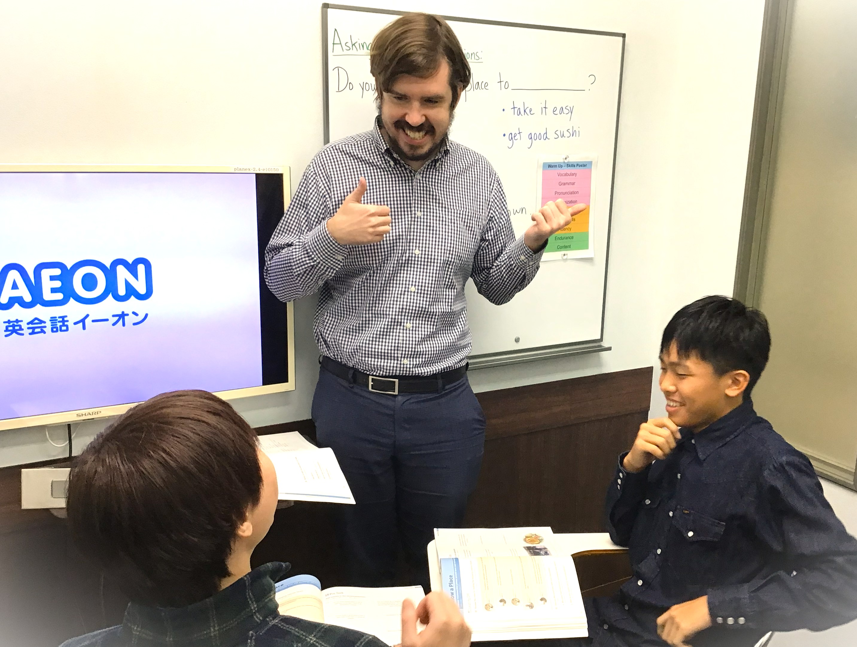 先生方はネイティブで、日本語があまり話せないため、日本語が話せる先生もいて良かった。
