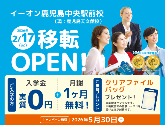 イーオン鹿児島天文館校はイーオン鹿児島中央駅前校として2月17日(火)JR鹿児島中央駅東口から徒歩3分 Dグランデ鹿児島中央1階に移転OPENいたします。