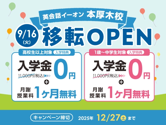 イーオン本厚木校は 9月16日(火)本厚木駅 北口から徒歩8分Lavie本厚木ビル2階 に移転OPENいたしました。